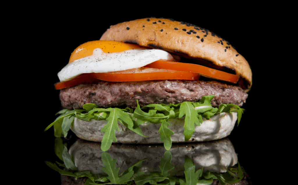 A burger with juicy beef in an unveiling perfect for breakfast! Perfectly matched sauces, crunchy vegetables and a spilled egg create the perfect whole encased in a bun.