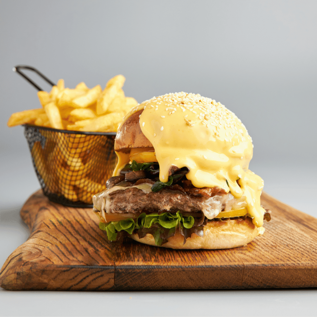 A traditional beef burger in a cheesy version! Juicy beef combined with vegetables and sauces encased in a bun. All covered with hot cheese sauce and served with fries. Cheese madness not only in winter!