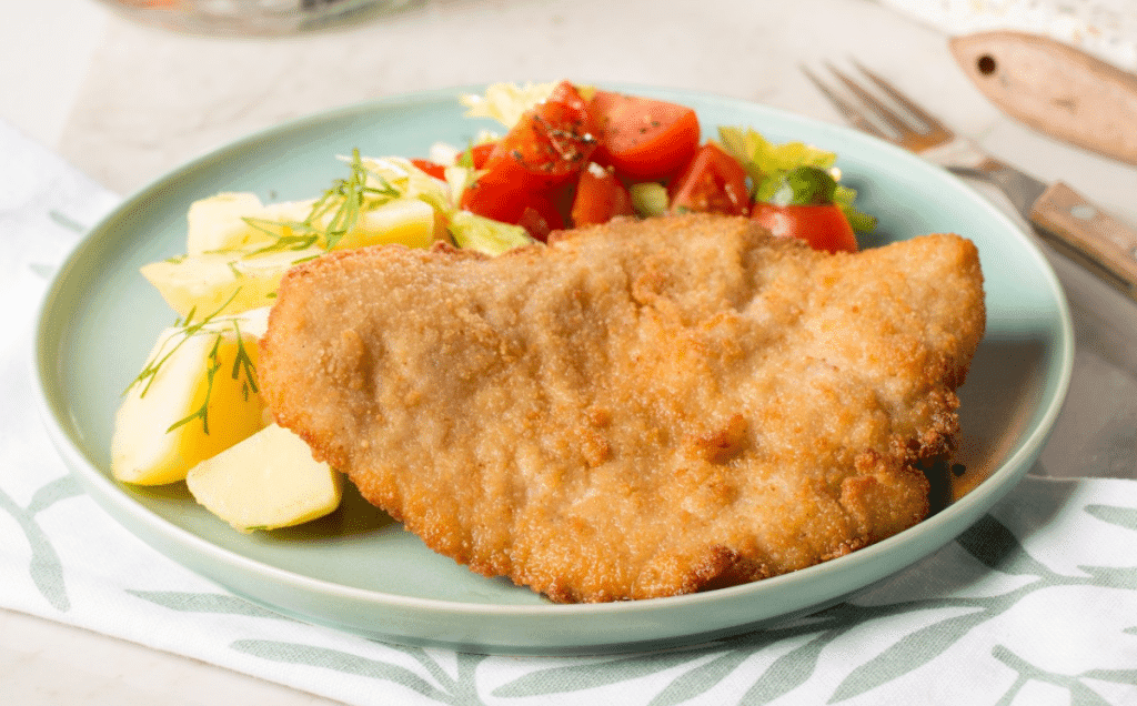 Classic dishes on a plate that everyone will enjoy! Juicy handmade chicken fillet, served with traditional potatoes sprinkled with dill and salad.