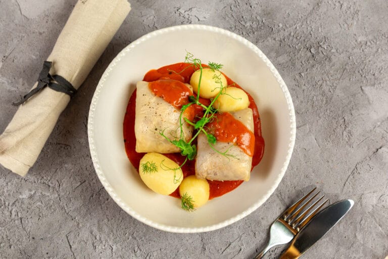 Classic dishes on a plate that everyone will enjoy! Juicy handmade chicken fillet, served with traditional potatoes sprinkled with dill and salad.