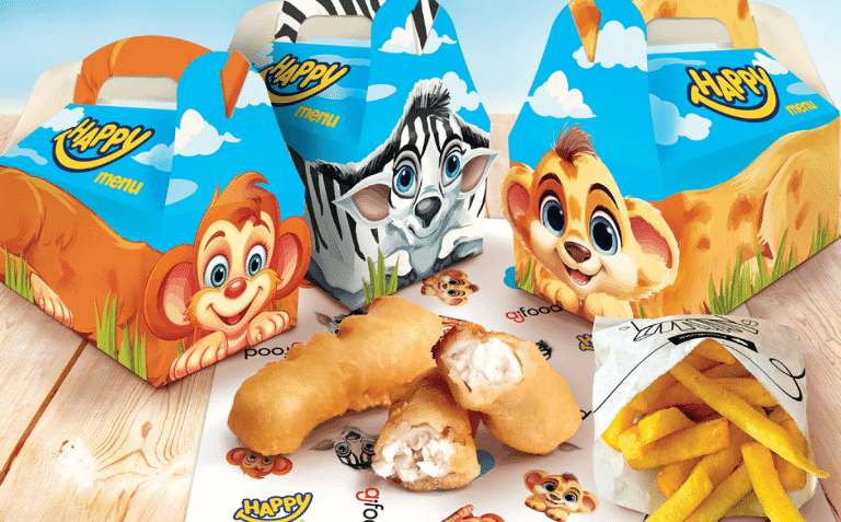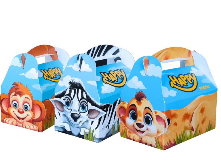 Compose a set for the youngest gourmets. The animal-shaped cardboard box is ideal for serving the set with strips and chips.