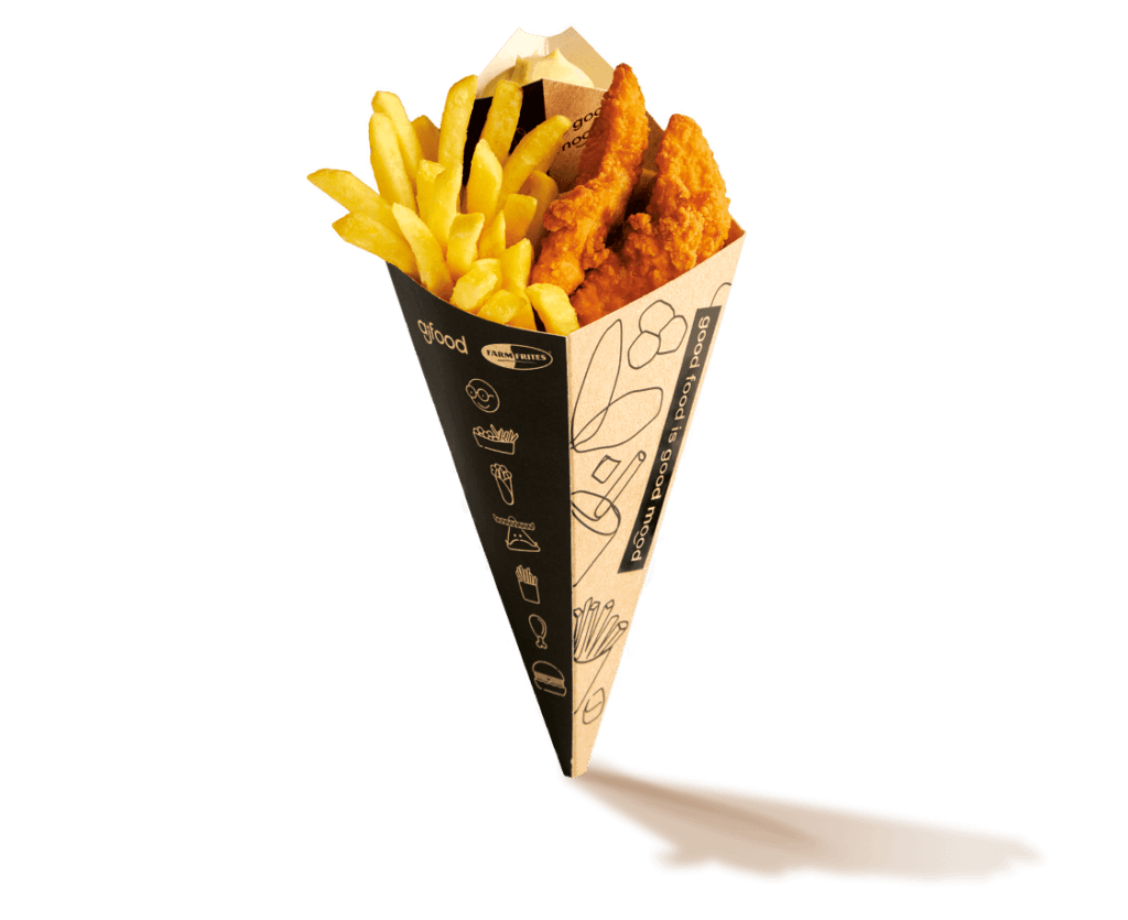 Sets that you can take anywhere! Crispy chicken strips served with fries in a convenient cone.