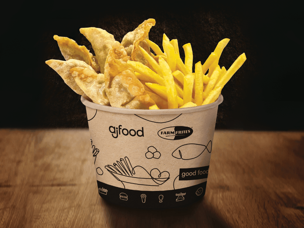 | Fry the gyoza (deep fryer: 2-2.5 min/170°C) and the fries (deep fryer:1.5-2 min/ 175°C). |