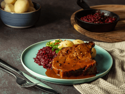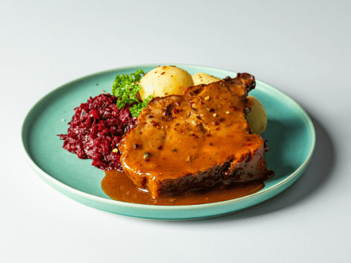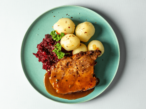 Roast slices of pork neck in roast sauce served with potatoes and beetroot salad.