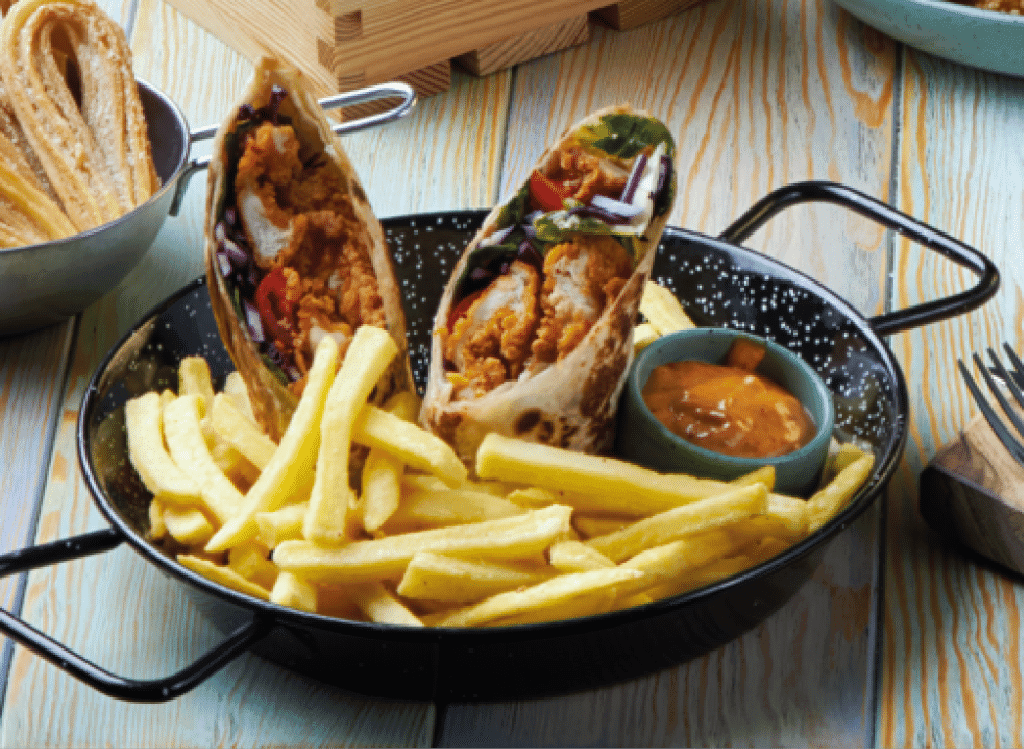 One product, many ways to serve! Chicken strips served in a wheat tortilla with vegetables and a perfectly matched sauce accompanied by fries.
