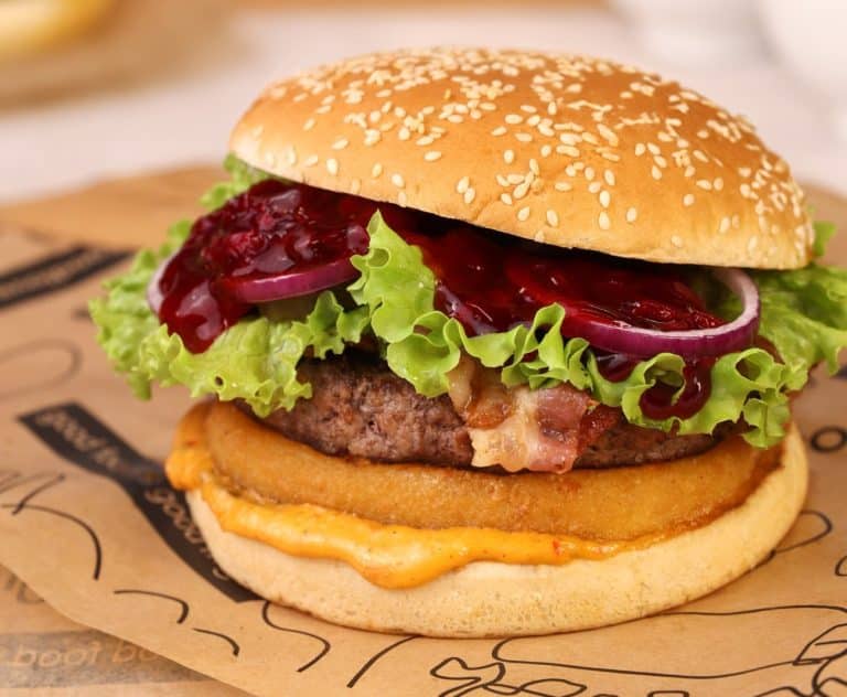 | Arrange lettuce, tomato, meat, bacon, mushrooms, lettuce and tomato one by one on the bottom of the bun. |