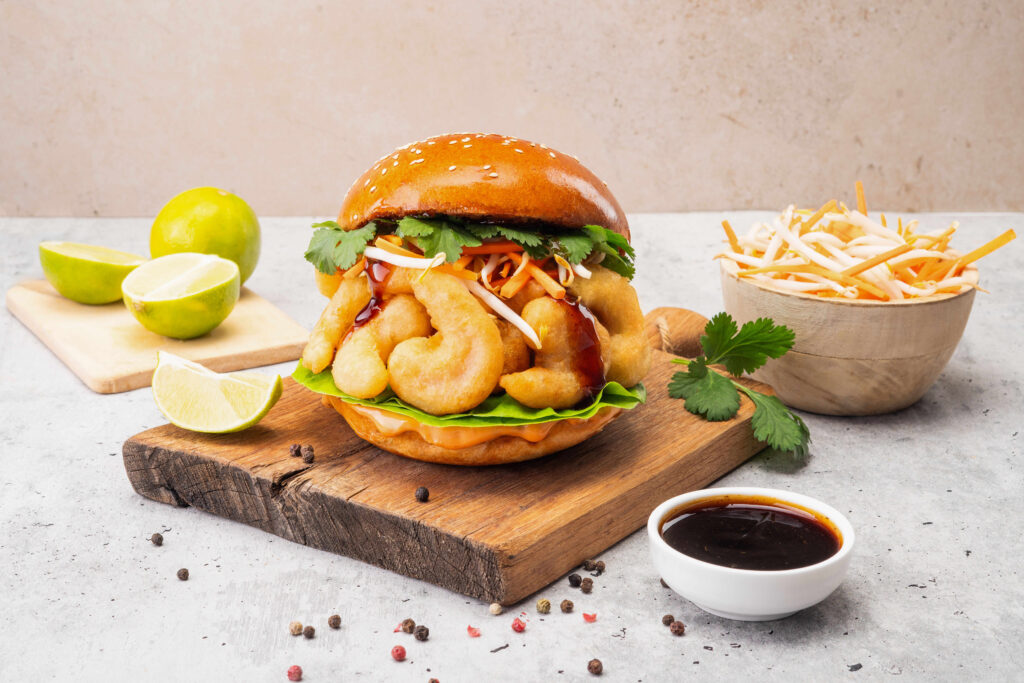 Burger z krewetkami z dodatkiem chrupiących warzyw w aromatycznym, azjatyckim sosie.
