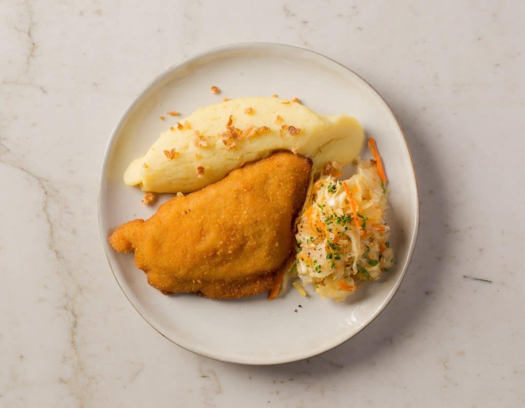 Klasyczne dania na talerzu, które zasmakują każdemu! Tradycyjny cordon bleu podany z purée ziemniaczanym oraz surówką z kapusty.