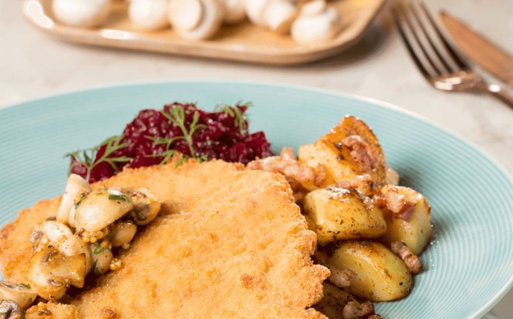 Klasyczne dania na talerzu, które zasmakują każdemu! Tradycyjny, ręcznie robiony kotlet schabowy podany z ziemniaczkami podsmażonymi z boczkiem i buraczkami.