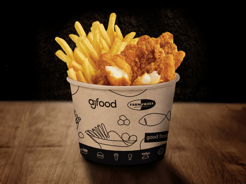 Łupacz w chrupiącym panierze podany z frytkami w kubełku