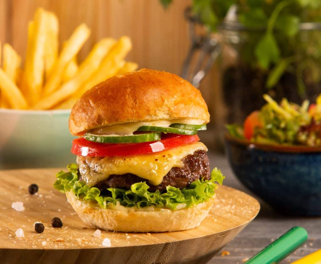 Klasyczna odsłona burgera w mniejszej wersji! Soczyste mięso wołowe skomponowane z serem i warzywami. Wszystko wykończone sosem.