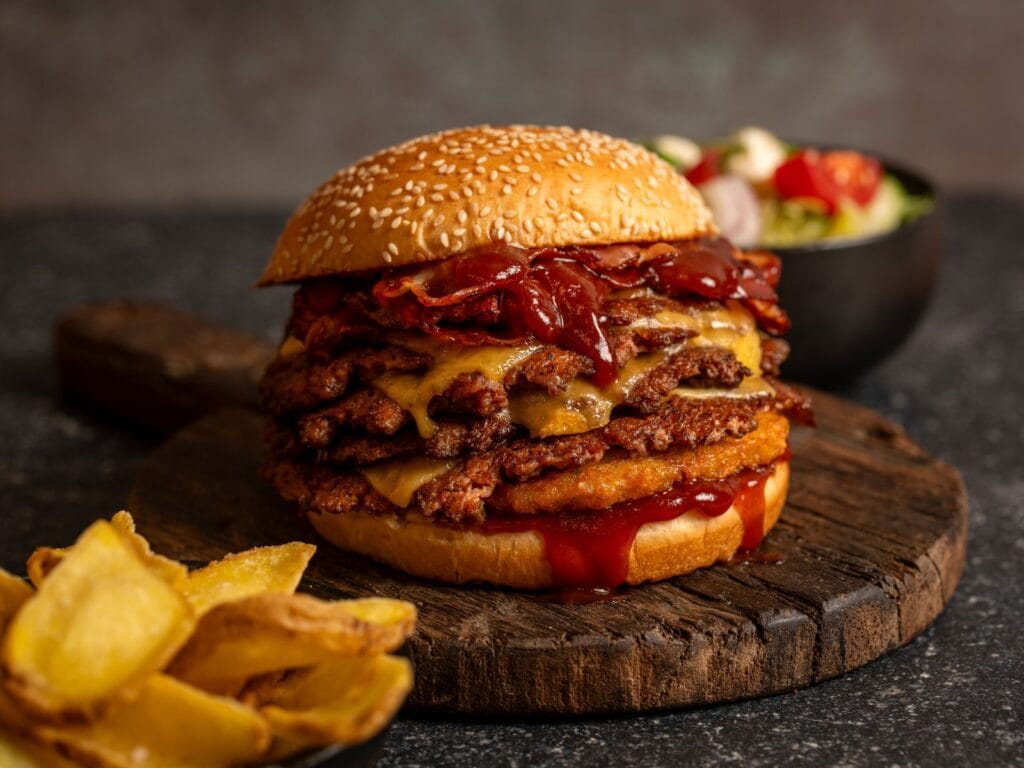 Burger BBQ z dodatkiem chrupiącego placka. Ciekawa odmiana popularnego wariantu.