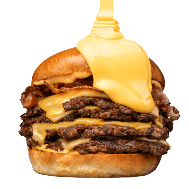 Burger mega napakowany. 4 warstwy zesmashowanej wołowiny i super gęsty sos serowy. Dla bardzo głodnych zwolenników mocnych wrażeń.