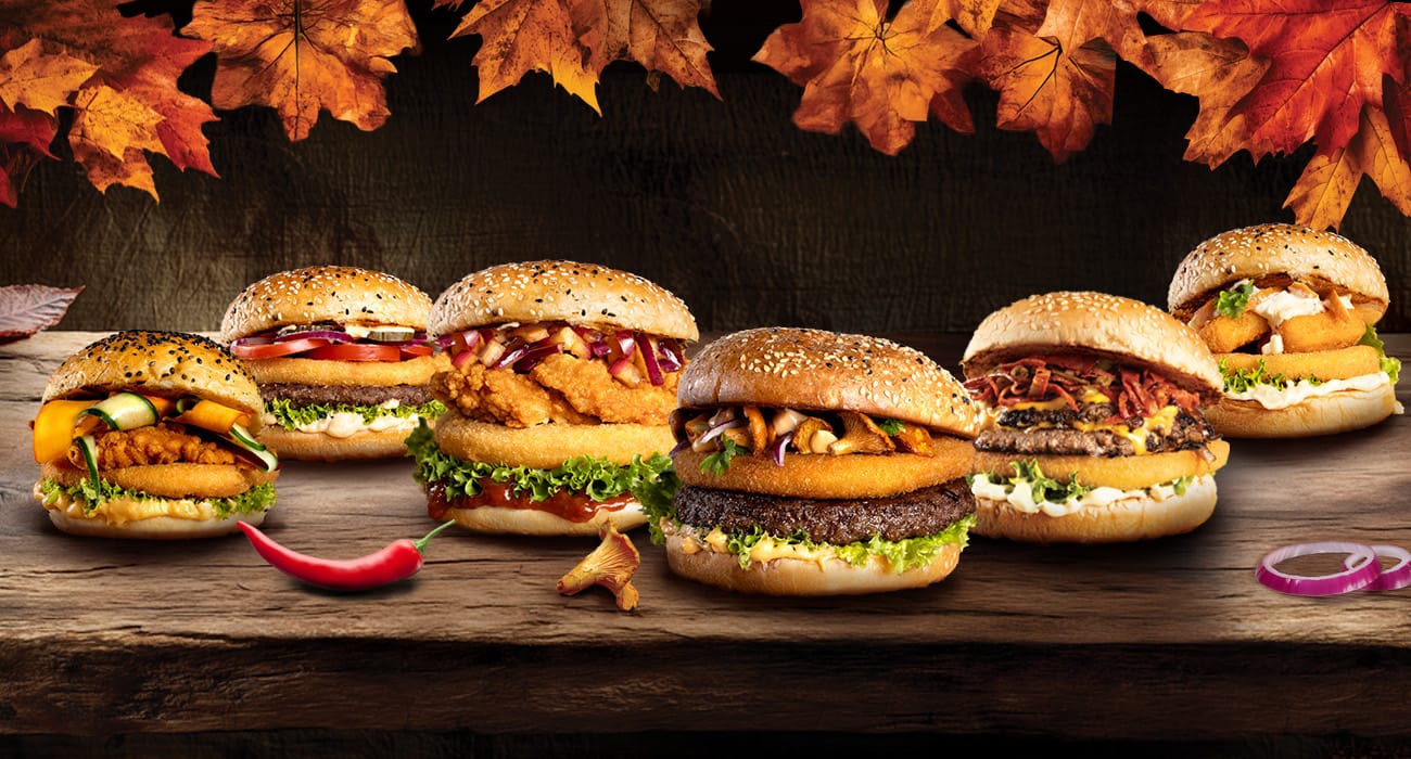 na polskie grzyby (złociste kurki, borowiki), marynowaną dynię i odrobinę pikantności (chorizo, papryczki jalapeño). Do tego koniecznie panierowany ser i  główny składnik do wyboru – np. burger wołowy, stripsy lub nuggetsy